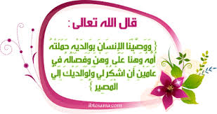 وَوَصَّيْنَا الْإِنسَانَ بِوَالِدَيْهِ حَمَلَتْهُ أُمُّهُ وَهْناً عَلَى وَهْنٍ وَفِصَالُهُ فِي عَامَيْنِ أَنِ اشْكُرْ لِي وَلِوَالِدَيْكَ إِلَيَّ الْمَصِيرُ